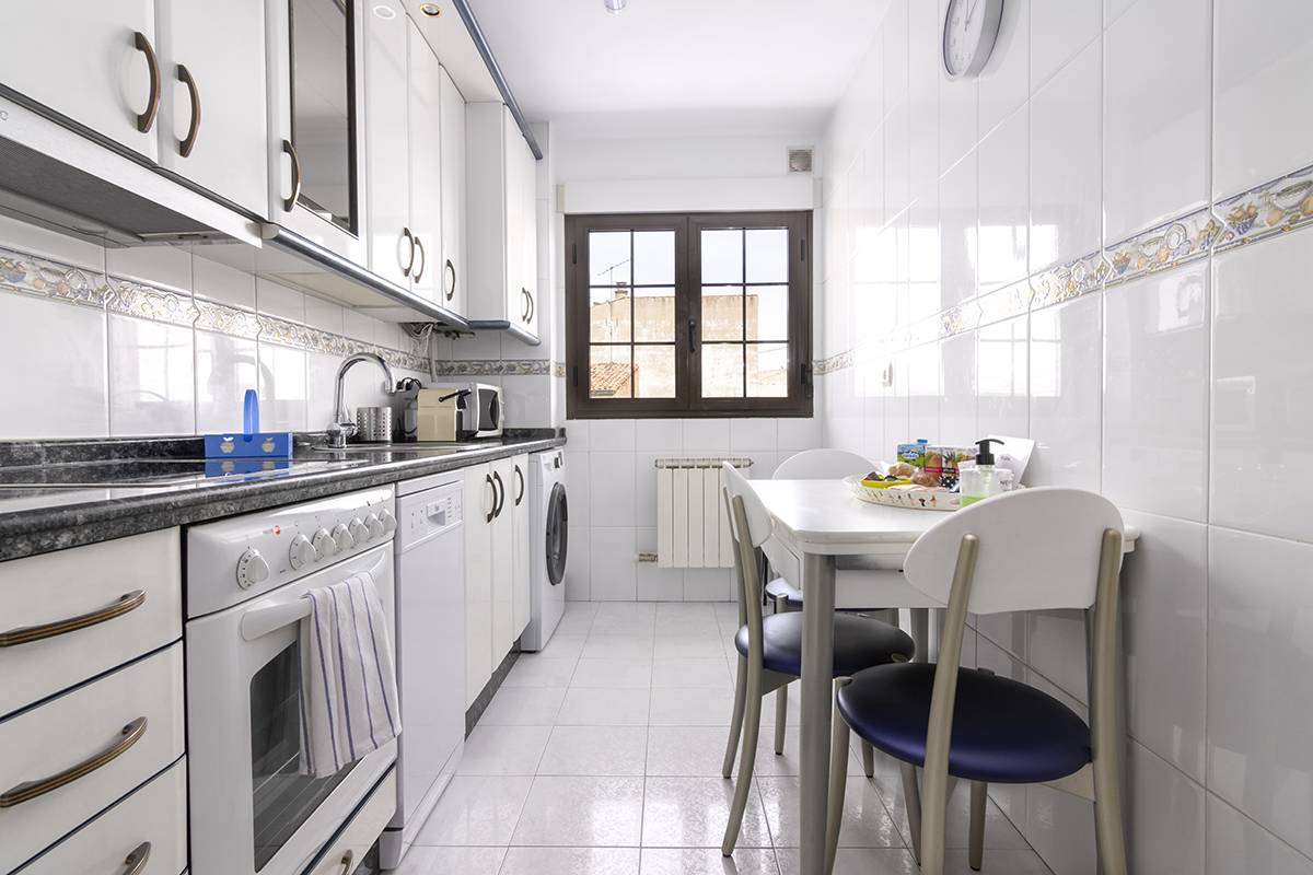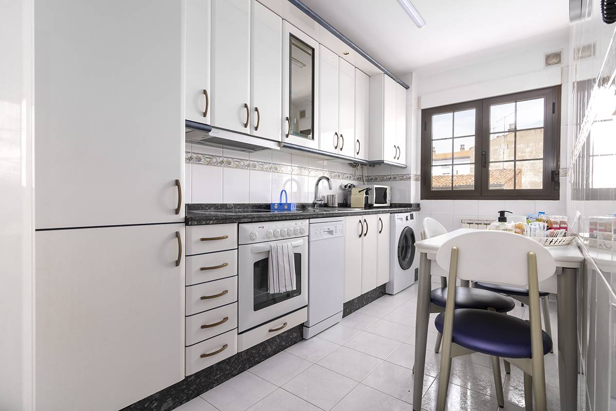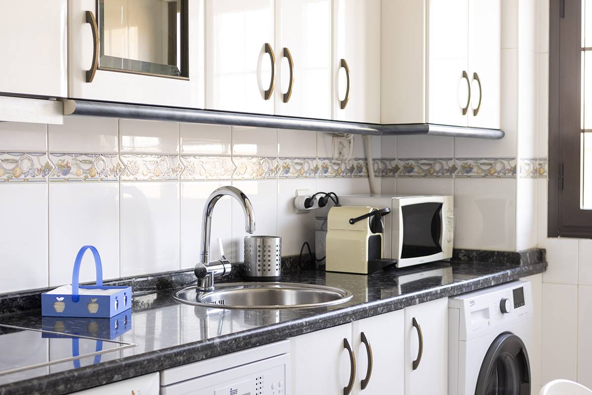 La cocina está equipada con todo lo necesario para cocinar y comer: placa vitrocerámica, campana, horno, microondas, combi, lavavajillas, cafetera, tostadora, mesa, cubertería, etc.